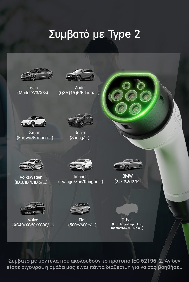 Απολαύστε αξιόπιστη φόρτιση με το ευέλικτο καλώδιο μας. Συνδεθείτε σε οποιονδήποτε δημόσιο σταθμό φόρτισης για αποτελεσματική, χωρίς προβλήματα τροφοδοσία. Μείνετε συνδεδεμένοι με αυτοπεποίθηση και ευκολία.
